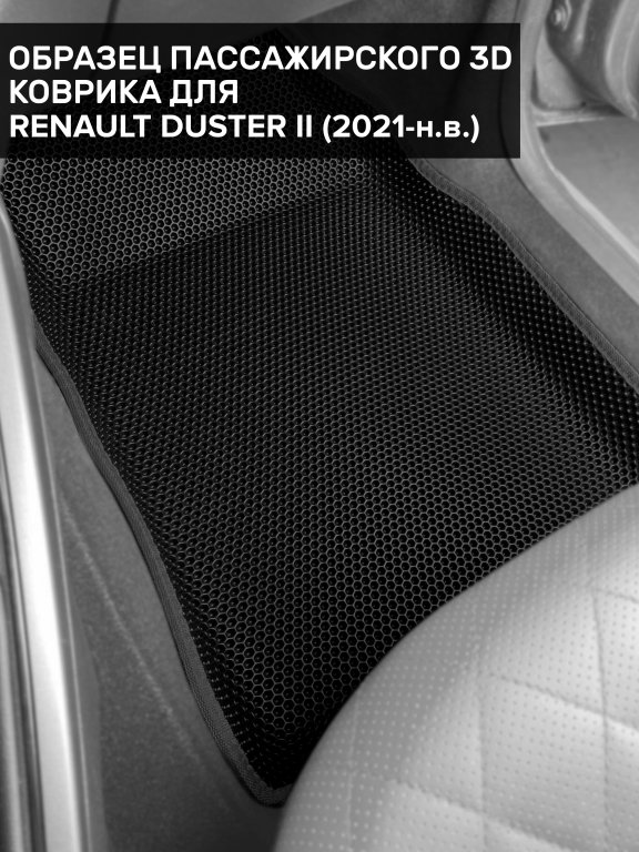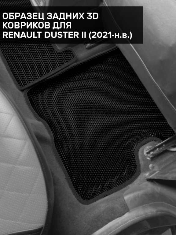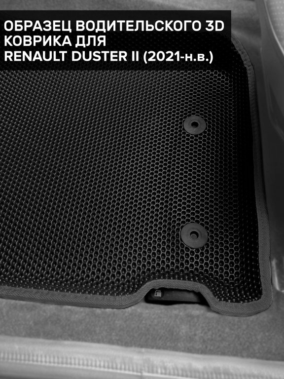 Автомобильные 3д коврики для Renault Duster II (2020-н.в.) в салон авто и багажник сделаны из инновационного полимерного материала EVA, изысканная структура в виде ячеек не дает воде, пыли и снегу разлетаться по салону машины и багажнику. 3д коврики зафиксированы на полу определенными клипсами, соответствующими Renault Duster II (2020-н.в.), и не двигаются в процессе езды.